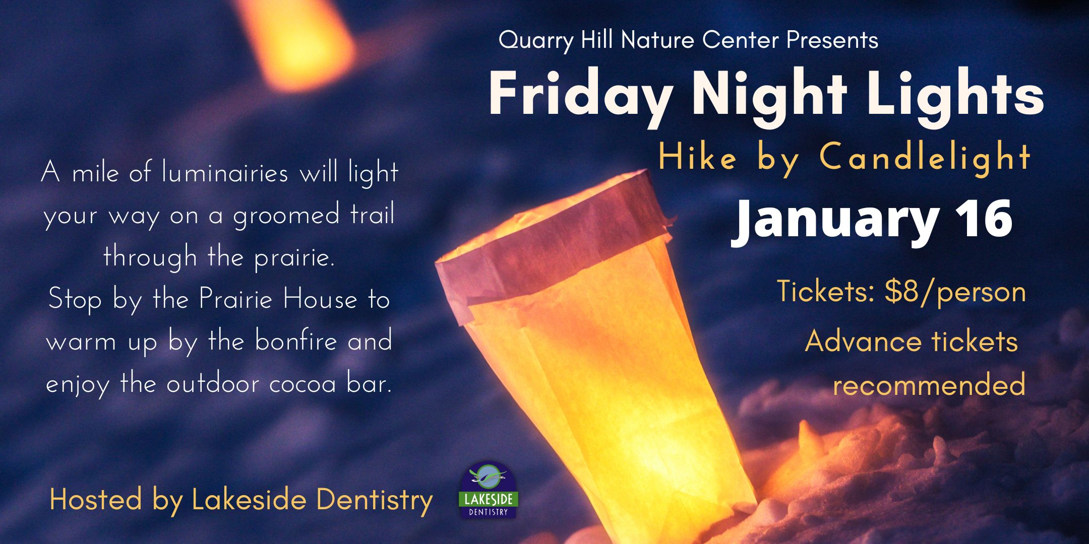 Follow the glow of candlelight through the woods as you walk through the Valentine themed 'Who's Kisser is it?' trivia trail. Then, warm up by the fire inside the Nature Center. Enjoy an adult beverage from the gourmet hot cocoa bar, a sweet chocolate treat, and a nighttime view of Quarry Hill's animal ambassadors.