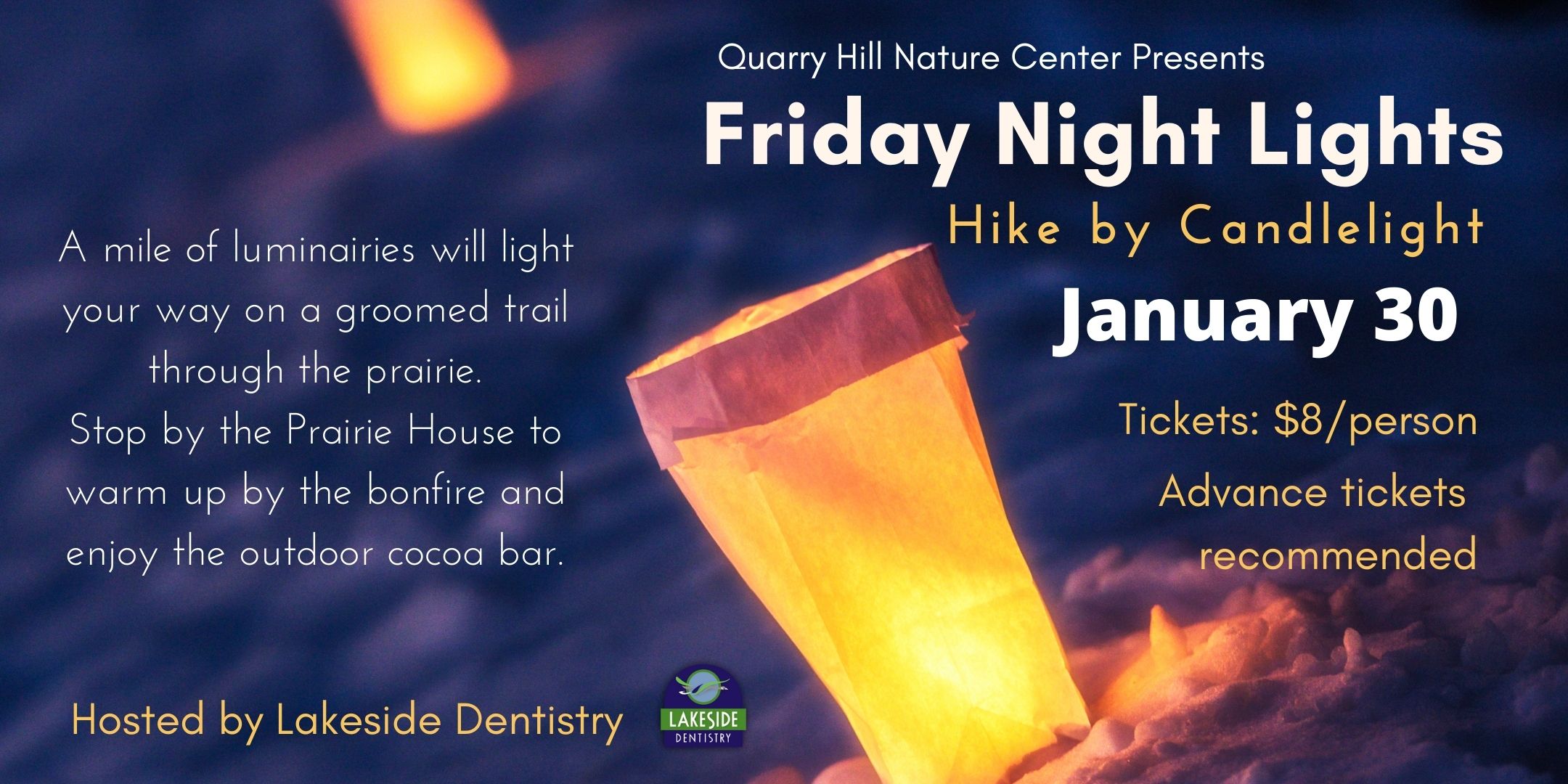 Follow the glow of candlelight through the woods as you walk through the Valentine themed 'Who's Kisser is it?' trivia trail. Then, warm up by the fire inside the Nature Center. Enjoy an adult beverage from the gourmet hot cocoa bar, a sweet chocolate treat, and a nighttime view of Quarry Hill's animal ambassadors.